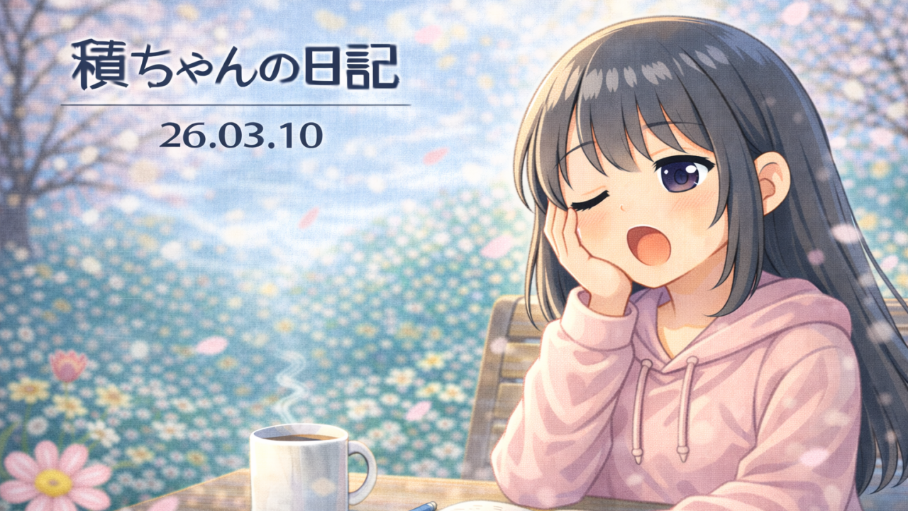 積みちゃんの日記 積ちゃんの日記 26.03.10 sinosino365 2026年3月10日 / 2026年3月10日 こんにちは、積みちゃんです。 今日は、少し眠たい一日でした。 正直、集中できてないな、と思いました。 でも、流れを止めなかったので、今日はそれでよし。 積みちゃんのひとこと:「低速でも、前進。」 また明日。 日記